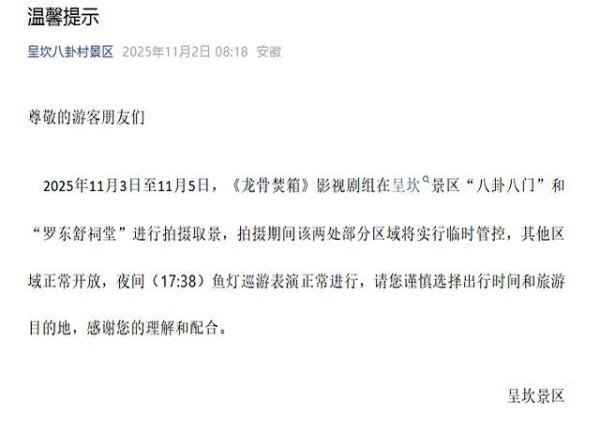 呈坎景区在11月2日发布提示,11月3日至5日对部分区域实施临时管控,影响了“八卦八门”和“贞靖罗东舒先生祠”两处景点的正常参观。