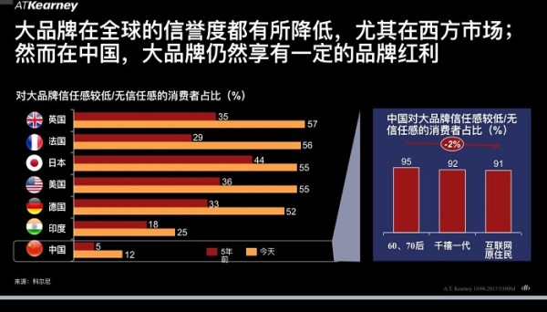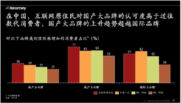 与此同时,虽然大公司在中国还享有一定品牌红利,但年轻一代中国消费者对国产品牌的认可度显著提升。超过71%的互联网原住民一代表示,他们对本土知名品牌的信任感上升,正向趋势超过国际品牌。中国本土品牌崛起指日可待。