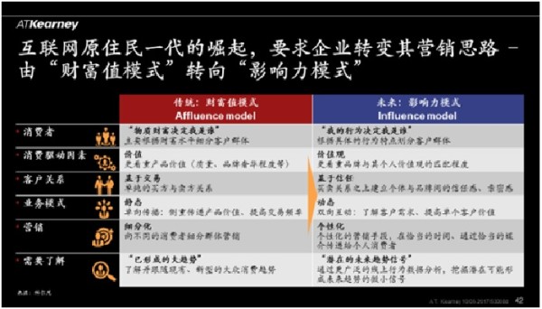 面对崛起的互联网原住民一代,消费品和零售企业也应调整其品牌运营思路,科尔尼将之总结为由“财富值模式”到“影响力模式”的转型。