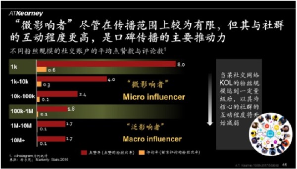 在“影响力模式”中,识别适当的社群“影响者”— 即意见领袖 (KOL) – 作为传播媒介是品牌运营的重点之一。对此,科尔尼提出了“泛影响者(Macro influencer)”和“微影响者(Micro influencer)”的区别概念。娱乐明星、微博百万大V等由于其传播覆盖范围广,可被视为“泛影响者”;而一些几万甚至数千粉丝的美妆博主、美食博主等,传播范围相对有限,称为“微影响者”。