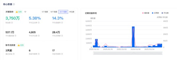 根据我司平台监测数据,甲亢哥账号目前表现出以下关键指标: