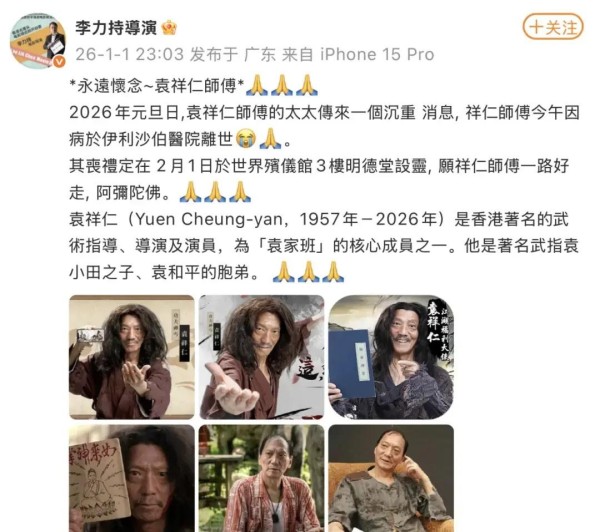 1月1日晚,香港导演李力持在个人微博上透露,香港著名演员、武术指导袁祥仁1月1日因病于伊利沙伯医院去世,享年69岁。丧礼定在2月1日于世界殡仪馆3楼明德堂设灵。