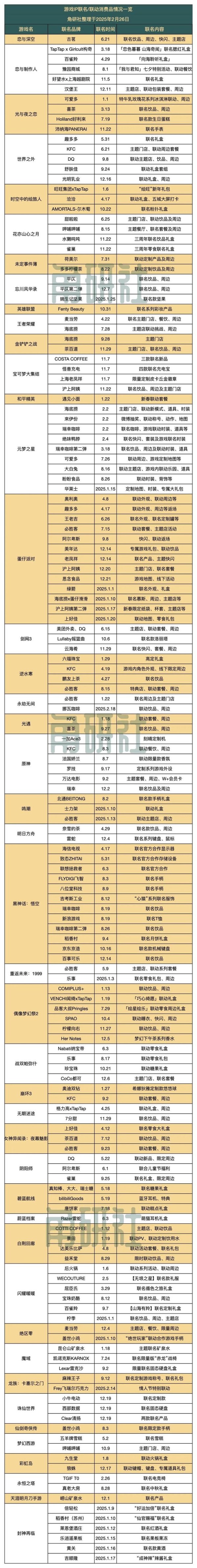 44款游戏,一年超153起消费品牌合作