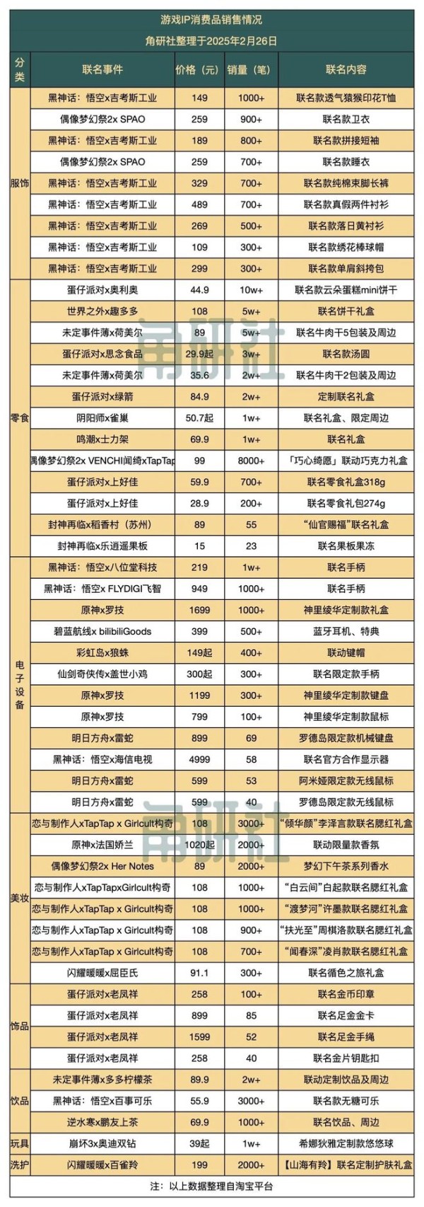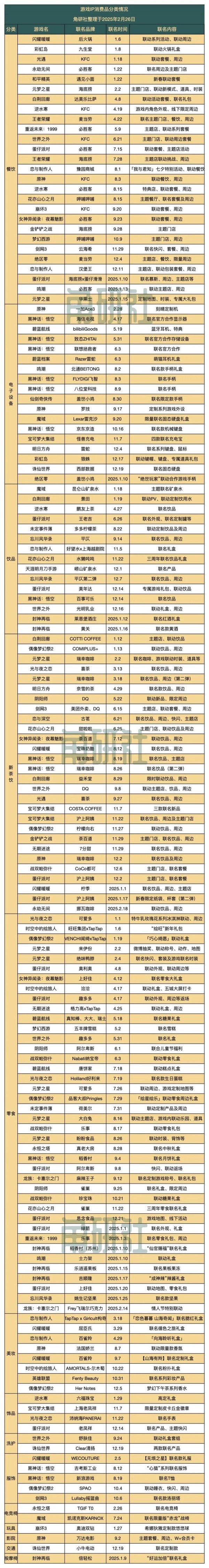 角研社整理了50个游戏IP合作的消费品品牌分类情况,具体情况如下: