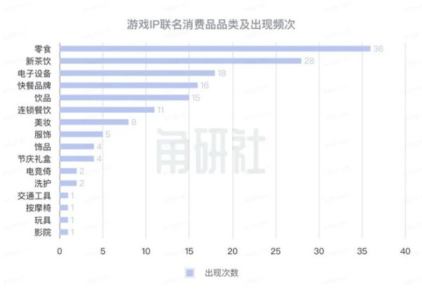 这些消费品品牌与这50个游戏IP的合作频次是:零食(40)、新茶饮(28)、餐饮(27)、电子设备(18)、饮品(15)、美妆(8)、服饰(5)、饰品(4)、洗护(2)、电竞椅(2)、玩具(1)、影院(1)、交通(1)、按摩椅(1)。【注:括号内为联名事件次数】