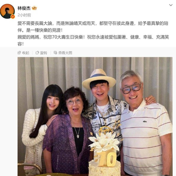 林俊杰在个人社交平台上晒出了家人陪妈妈庆生的温馨合照。