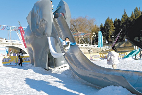 承载许多市民童年记忆的大象滑梯亮相陶然亭冰雪嘉年华。