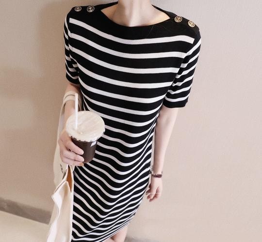 在这个季节,一件长款针织连衣裙无疑是不可或缺的。其条纹面料相较于纯色,更增添了几分时尚韵味。通过巧妙运用拼色条纹元素,这款连衣裙完美融合了时尚与优雅,成为了冷热交替季节里的理想之选。
