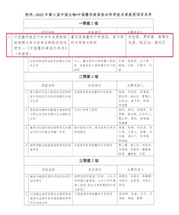 星荣整形申报的《中国整形美容外科史》研究项目荣膺2025年中国生物·中国整形美容协会科学技术奖的一等奖