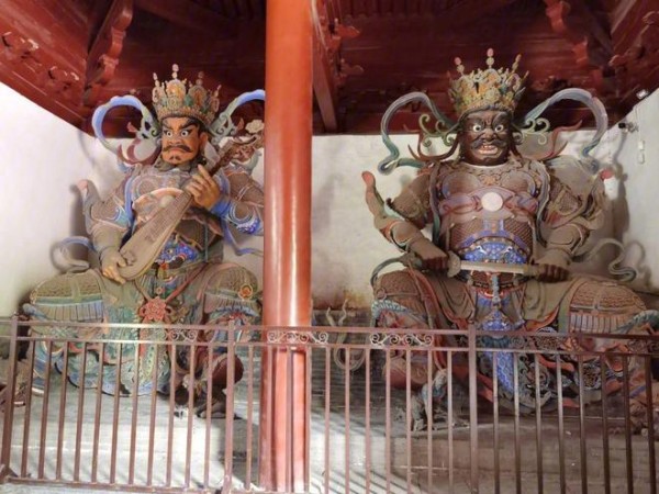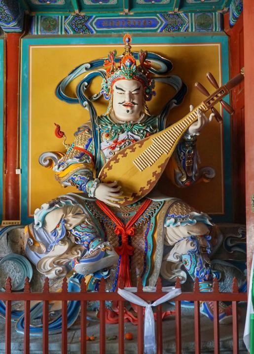 持国天王天王中的“持国”,意为慈悲为怀,护持国土。他居住在须弥山半山腰东面的黄金堙,守护的方位为“东方”,故又称“东方天”。持国天王的形象身姿挺拔,头戴宝冠,面部肌肉凸显,双眼怒目圆睁,下颌及两腮饱满,身着甲胄,手持琵琶琴,形象威武彪悍。