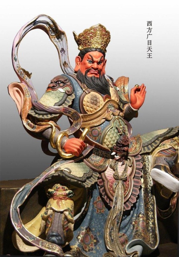 广目天王居住于,须弥山半山腰西面的白银士垂,这座城非常庄严洁净,瑰丽无比,殊胜非凡。广目天的本誓为惩罚罪者,令作恶者尝尽艰辛,广目天王的形条为一面二臂,目圆而外凸,虬须飞动,头戴龙盔,身穿铠甲,在披膊上有双狮兽头,左手持程宝珠并举至胸前,右手捉着一条龙,广目天王居高临下微微收领府视,流露出一种不可抗拒的威严和阳刚之气。