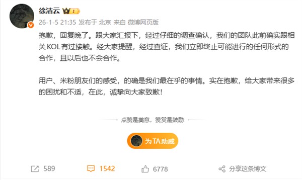 1月5日,小米集团相关负责人就近期引发关注的KOL合作争议作出回应。该负责人表示,经内部核查确认,公司团队此前确实与涉事KOL存在过接触。在收到各方反馈后,已第一时间查证并决定终止任何可能的合作计划,并明确今后不会与其开展任何形式的合作。