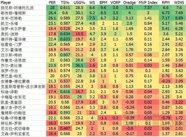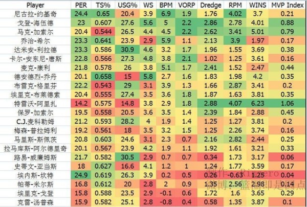 PER:球员效率评级,在联盟平均值为15的基础上得来的,球员每分钟产出的标准化衡量,来源BBR。
