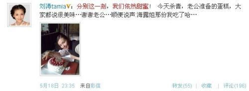 刘涛(http://t.sina.com.cn/1197191492)微博晒蛋糕秀恩爱