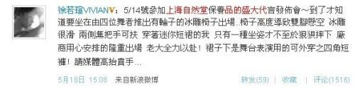 徐若瑄5月14日在上海出席代言活动时被安排坐在没有把手的冰雕椅子上出场,双脚悬空又没有把手可扶的Vivian 安全 裤在迷你裙下乍现,她解释说这是可以外穿的四角裤,还好言肯定媒体高抬贵手放自己一马。