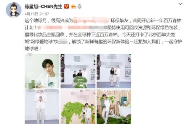陈星旭为环保公益做宣传,更博晒照却被显微镜女孩发现亮点 近日,“太子殿下”陈星旭现身某品牌以“地球月”为主题的环保公益现场做宣传。之后,陈星旭在微博营业晒出了活动现场的高清美图,并且配文称“这个地球月,很高兴成为环保挚友,共同开启新一年百万森林计划!”同时邀请粉丝们一起参与到活动中去,这波公益让人称赞。