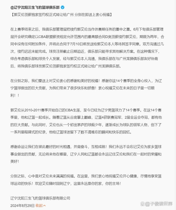 面对诸多讨论,8月29日,辽宁俱乐部通过官方社交平台发布了一篇详细声明,宣告:郭艾伦的顶级合约专属签约权已正式转移至广州队,并预祝他未来一切顺利。