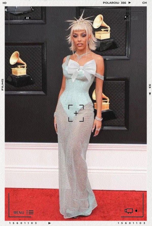 Doja猫以莱茵石为装饰,身着薄荷色拖地网眼礼服,细节之处尽显匠心。内搭的修身连体衣不仅突显其苗条身姿,更增添了几分性感。为了成为全场的焦点,这位演唱《Say So》的歌手特意选择了高跟鞋,并佩戴了华丽项链与手镯,而左手上那颗璀璨的钻石戒指更是吸引了无数目光。
