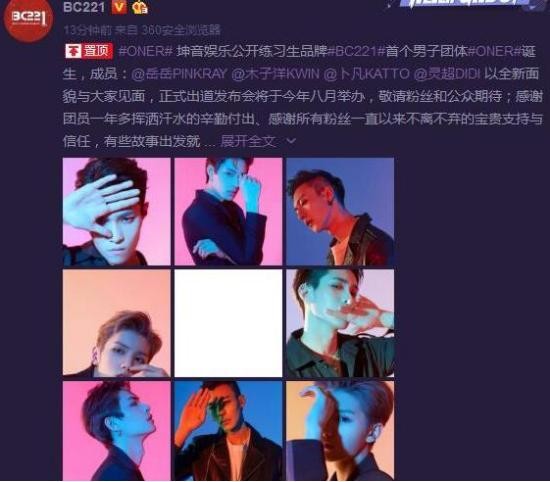 当然,有很多网友喜欢的爱豆有的还没有出道,但是小编要告诉大家一个好消息,坤音娱乐公开练习生品牌#BC221#首个男子团体#ONER#诞生,成员:岳岳PINKRAY ,木子洋,卜凡,灵超,以全新面貌与大家见面,正式出道发布会将于今年八月举办。