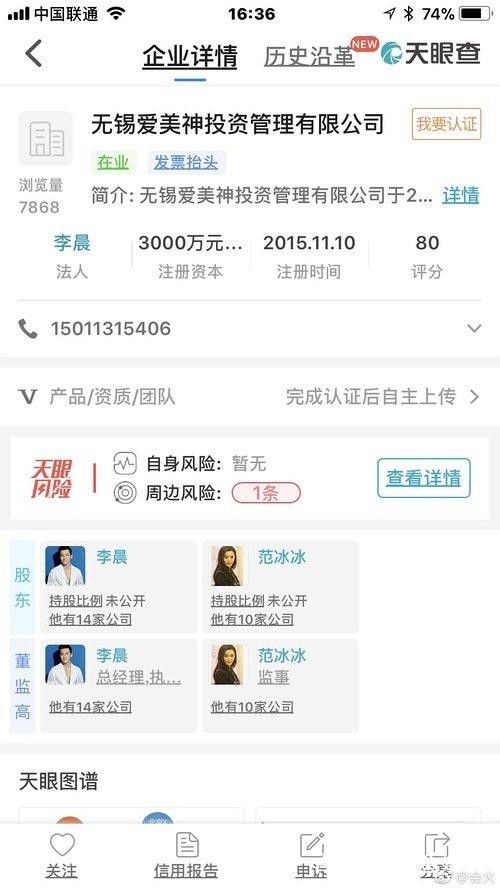 近日,疑似范冰冰自有的化妆品品牌创立,取名为FANBEAUTY,在品牌简介中的备文是:By Fanbingbing。有网友通过微博的注册公司“爱美神投资管理有限公司”顺藤摸瓜找到了公司的详细注册人,原来,这是一夫妻店,李晨是法人代表,范冰冰是股东,注册资金3000万,早在2015年就已经注册,两人共同执掌公司。
