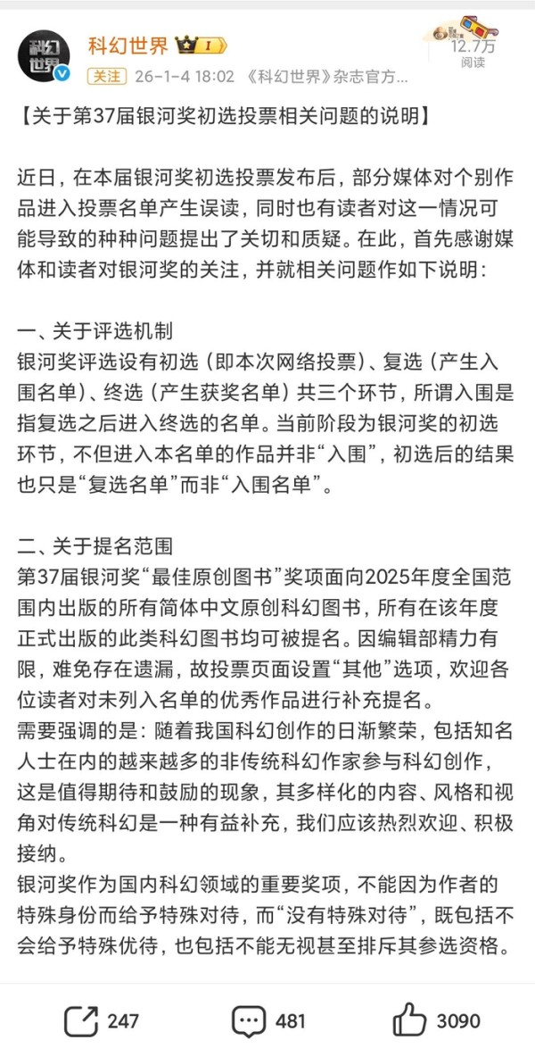 1月4日,第37届银河奖组委会在社交媒体平台发布相关说明,回应读者对这一情况的关切和质疑。从提名范围来看,第37届银河奖“最佳原创图书”奖项面向2025年度全国范围内出版的所有简体中文原创科幻图书,所有在该年度正式出版的此类科幻图书均可被提名。