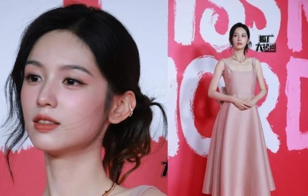 周也那次穿的粉色长裙,配上银色高跟鞋,整体组合看起来有点像伴娘服,很是那粉色的方领