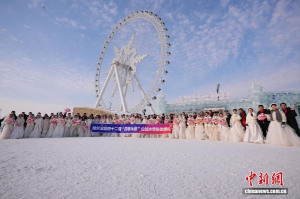 1月6日,哈尔滨第四十二届“四季沐歌”公益冰雪集体婚礼在哈尔滨冰雪大世界举行。 姜辉 摄