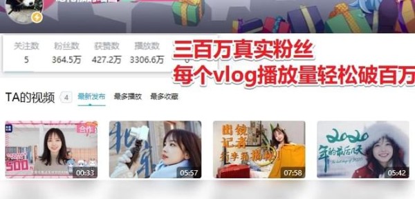 但这个粉丝数量是不是买来的呢?看看她发布的每一条vlog数据就知道了,第一条发布的vlog的播放已经超过了一千八百万,前后发布了四条vlog,最低的也有三百五十万!