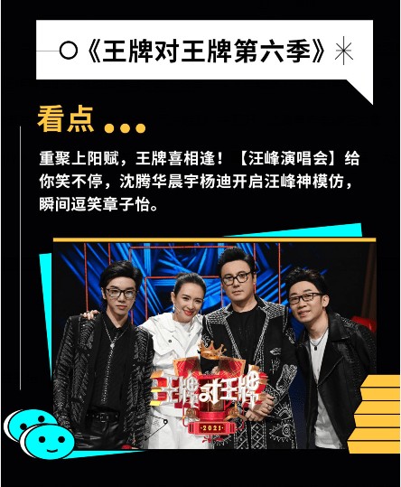 聚集了沈腾、贾玲、宋小宝等一线喜剧大咖的《王牌对王牌》第六季,目前在酷我音乐已上线6期,王牌舞台的主唱担当华晨宇自不待言,以《杀破狼》、《夜的第七章》等为代表,每一首歌曲都成了网友心目中的经典,而关晓彤、宋亚轩、沈腾等新老综艺力量,也都纷纷开启演唱style,给网友们带来惊喜。最新一期以“重聚上阳赋,王牌喜相逢”为主题,迎来“大腕”章子怡,沈腾华晨宇杨迪开启汪峰神模仿,瞬间逗笑章子怡,也令网友笑个不停。