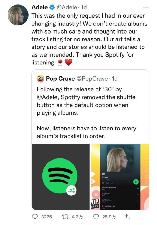 海外音乐平台Spotify取消了《30》随机播放的预设,这相当于听众在不手动操作的情况下,将按顺序一首一首地听下去。阿黛尔点赞了这个行为,并表示“我们的艺术讲述了一个故事,它应该按我们构想的方式被聆听”。