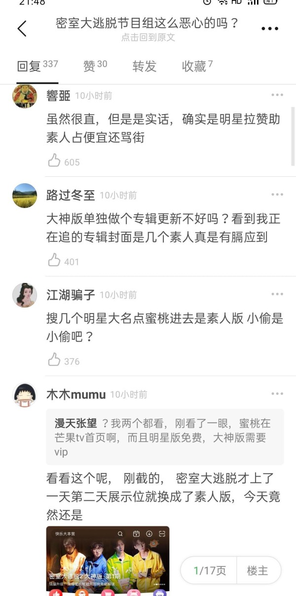 更可气的是,在明星版的《密室大逃脱》中弹幕中很多人嫌弃明星们都太笨了,不如去看大神版本的《密室大逃脱》,这样的言论出现在了微博中,知乎中,到处都有,喜欢看什么版本就去看,干嘛要去diss明星版本呢,如果没有杨幂邓伦等明星,大神版的《密室大逃脱》会有丝毫的热度吗?这种反咬一口,恬不知耻的行为,让人觉得恶心。