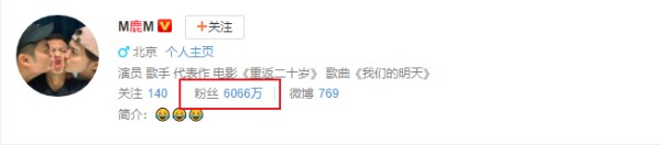 鹿晗微博截图 以最近备受关注的鹿晗为例,作为国内的顶流代表,鹿晗微博粉丝6000万,《上海堡垒》平均票价约为40元,如果这6000万粉丝能有1/3去买票支持,那么贡献的票房也不过8亿。
