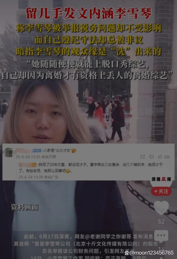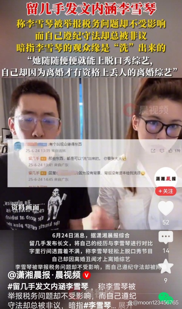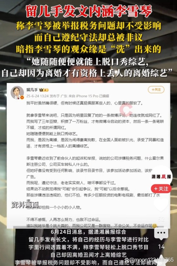 再看当下,李雪琴遭遇前合伙人实名举报,涉及公司税务问题,诸如霍尔果斯注册公司、公司车辆转私人等争议点被一一抛出。然而,现实的情况却是,李雪琴似乎并未因此受到过多影响,各类节目录制、活动出席以及广告拍摄依旧如常进行。反观留几手,自认为一直遵纪守法,老老实实做人,却总被平台以 “可能会引起争议”“可能以后会惹祸” 为由,限制资源,事业发展屡屡受阻。如此强烈的反差,进一步加深了留几手内心的不平衡。