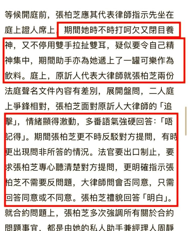 庭上盘问刚一展开,原告方律师便展开了猛烈的攻势,对每个细节都进行了详尽的追问。面对如此强大的压力,张柏芝的情绪逐渐失控,她无法忍受地哭喊道:“一切都是假的!”在庭上,合同的真实性成为了焦点。张柏芝表示,由于信任助理而草率签署了合同,现在对合同内容的真实性提出了强烈质疑。她曾将家务和琐事全权交由助手Emily(周静仪)打理,甚至包括银行卡密码。当时合约的具体内容她并未细阅,只是简单地信任了助理,便在合约上签了字。更令人震惊的是,她承认自己的签名风格多变,连自己都难以辨认,因此,合同上的签名是否真实,尚需笔记专家进一步鉴定。这样的“自辩”引发了网友们的热议。