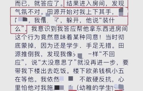 由于两人同为校友,彼此间的亲切感油然而生。田源热心地分享了他在演艺圈的宝贵经验,让这位女生深感他是一位贴心的“好师哥”。然而,在她逐渐放下戒心之后,田源却以取物为名将她带至房间。一进门,他便对女生做出了不当举动,甚至将她推倒在床上,言语中带着轻浮。好在女生保持冷静,躺在那里纹丝不动,田源最终觉得索然无味,并未进一步采取其他行动。
