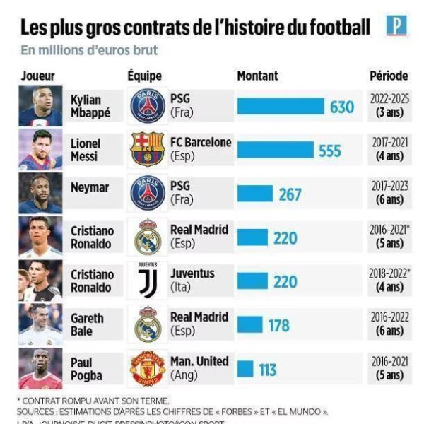 北京时间2022年10月24日讯,作为世界体坛第一大运动,足球在全世界有种无与伦比的影响力。相比其它领域,足球运动员赚到钱也是非常多的。近日,法国媒体盘点了足坛历史上最贵的七则合同,让我们看看都有谁: