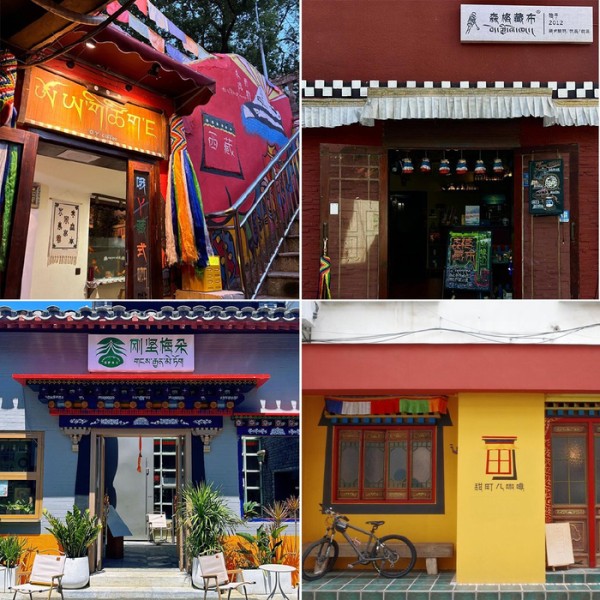 比如白玛顿珠、刚坚梅朵等藏语直译,又如喜渡、如院等词语传递吉祥寓意,再或者直接将藏语放在门头上作为品牌名。一眼看去,就比大街上随处可见的 XXX café 升高了好几个level。