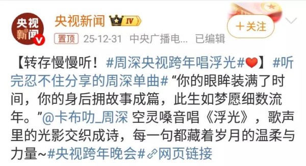 歌手周深参与2026央视跨年晚会,一首《浮光》引发众多网友关注!