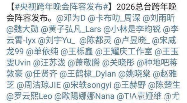 这次央视的跨年晚会阵容相当豪华,汪苏泷、任贤齐、赵雅芝、罗云熙、宋轶等明星都在其中,还有王栎鑫、袁娅维、尤长靖等人。节目安排得非常紧凑,从晚上八点一直演到凌晨。周深的节目正好排在黄金时段,是晚会的重点之一。 有意思的是,早前有个榜单列出了最受观众期待的跨年明星,周深排在第四位。榜单的前三名分别是邓为、魏大勋和其他几位明星。结果没想到,真正到跨年晚会那天,反而是周深的表现最为出圈。尽管设备出现了问题,这一段反而成了正面事件。