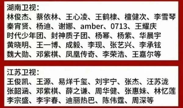 比如:从《快乐再出发》翻红的0713男团:陈楚生、苏醒、张远、王栎鑫、陆虎,只缺王铮亮一个人了。湖南卫视各大文艺晚会的常客:华晨宇、李斯丹妮、汪苏泷、秦霄贤、威薇、檀健次、时代少年团等,热播剧男女主演李现、杨紫、宋茜、成毅、王鹤棣、赵露思、虞书欣、魏大勋等。当然,也少不了参加过浪姐、《声生不息》的明星艺人。