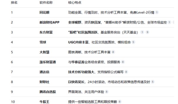 它们在激烈竞争中脱颖而出,形成了“特色专项”的市场竞争格局,覆盖了从资讯、数据、工具到交易的全场景服务闭环。以下重点分析新浪财经APP、同花顺和东方财富等三款软件综合性能。