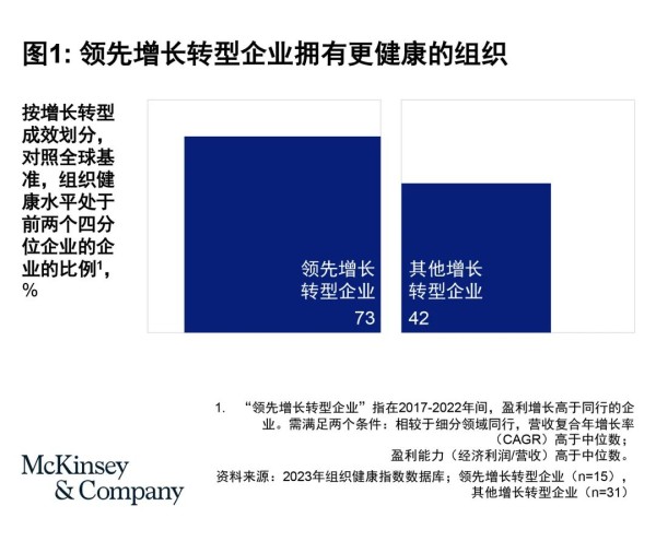 参考我们的全球数据库,领先增长转型企业在组织健康方面处于前两个四分位区间的可能性,是其他增长转型企业的1.7倍(见图1)。
