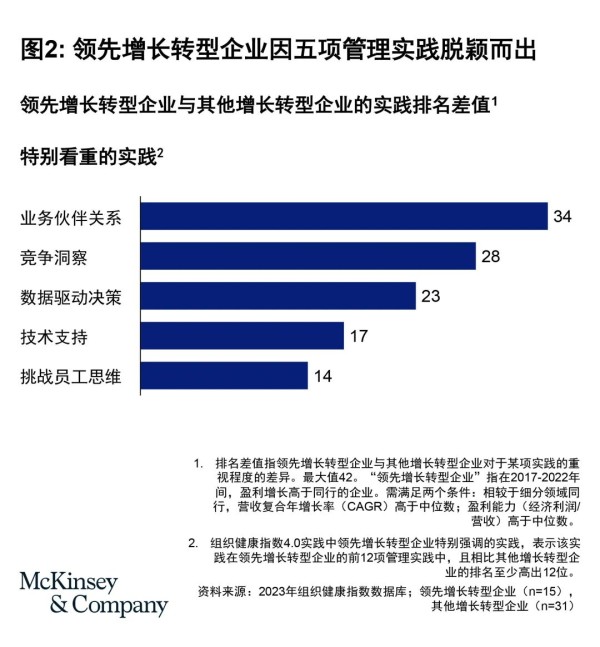 数据清晰表明,超越所在细分领域中位数水平的增长转型企业在以下五大方面采取了不同做法: