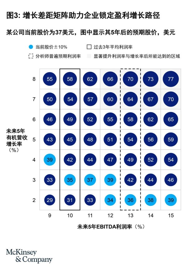 转型的第一步,是设定一个大胆的绩效目标,该目标通过外部标准衡量,且多围绕服务客户展开。本质上,这一目标绝非渐进式的小改进。有胆识的企业会深入审视市场事实:竞争趋势、客户洞察、投资者估值以及整体增长差距矩阵等(见图3)。这一分析过程会考量有机增长和利润率提升分别如何影响折现现金流,并最终作用于股价。它能帮助企业激活多种增长路径,包括扩展核心业务、向邻近领域创新发展、推动并购或开拓突破性业务等。基于市场事实的分析还能助力企业确立相应的市场定位目标。仅依据息税折旧摊销前利润(EBITDA)设定目标,往往过于局限。董事会通常能提供更全面的视角。