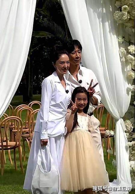 董璇身着一件素雅的白裙,张维伊的着装与她色调协调。他们的女儿小酒窝一袭金色连衣裙,仿佛童话里走出的公主。