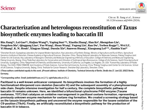 《Science》原文链接:Characterization and heterologous reconstitution of Taxus biosynthetic enzymes leading to baccatin III | Science