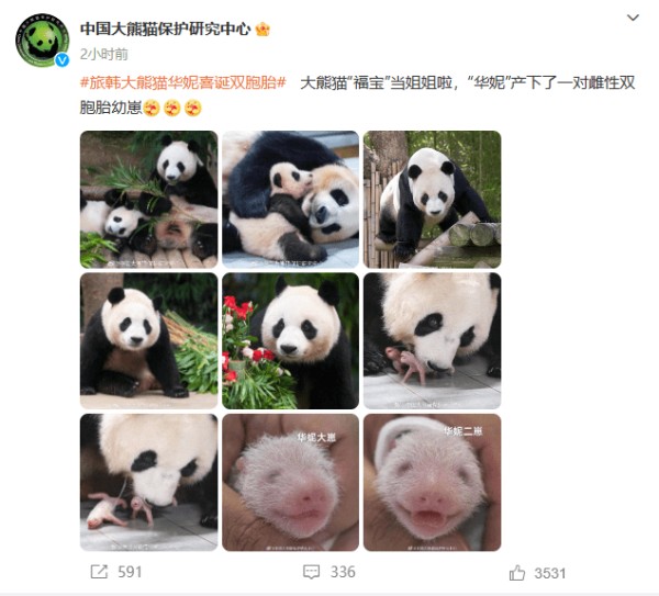 今天(7月11日)早上7点半,中国大熊猫保护研究中心(下文简称为“中心”)正式宣布,旅韩大熊猫华妮(爱宝)在7月7日诞下一对雌性双胞胎幼崽。