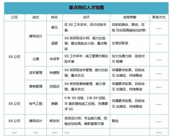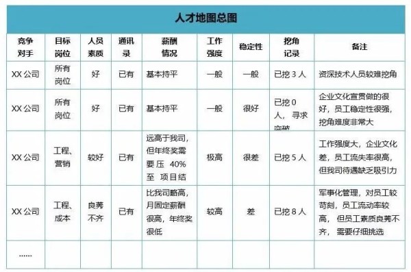 在完成《重点岗位人才地图》后,HR还需要分类整理竞争对手相关情况,完成《人才地图总图》,方便后续管理。