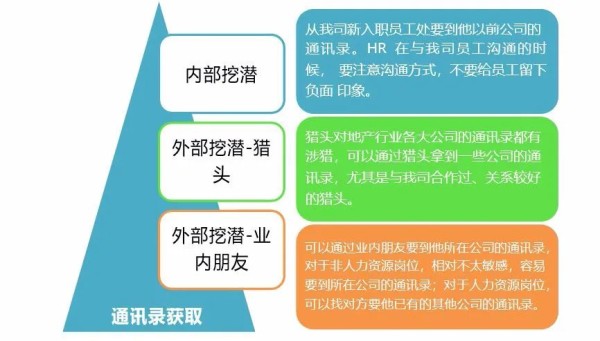 竞争对手通讯录的获取主要靠人脉,这和 HR本身的积累有关系,没有什么速成的 办法。以下罗列几种实操过程中的可行办法,供大家参考。
