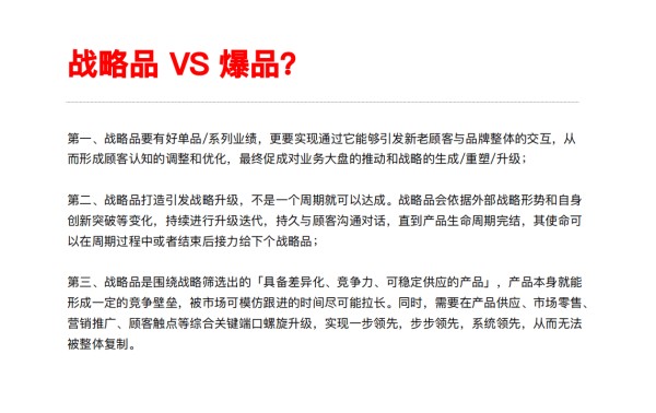 所谓“战略品”,其核心在于超越单一产品的销售成功。它必须根植于清晰的顾客价值,围绕品牌的核心战略中轴展开,能够开创或对接新需求,并具备认知上的创新性。与追求瞬时流量的“爆品”不同,战略品的使命是通过持续的战略性投入,与消费者进行深度交互,最终目标是提升整体业务大盘和品牌经营质量。它要求产品本身能构建竞争壁垒,并通过供应、零售、营销等端口的螺旋式升级,实现系统性领先,让对手难以复制。